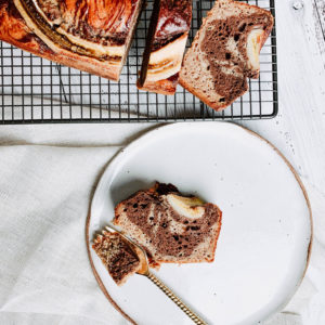 Pour the mixture into a lined loaf tin. - If making the cacao swirl, alternate putting in spoonfuls of the plain banana and cacao, creating layers. Afterwards, gently swirl the mixture with a skewer